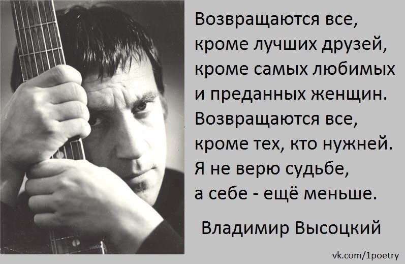 //«Иногда кажется, что это через него (Высоцкого) просто Господь явил себя народу во время надежд и потом в глухое безнадежное время» (Михаил Веллер)// В одной из передач «Один» ДЛ Быкову был задан вопрос: «О чём стихотворение «Я никогда не верил в миражи?» Почему оно безысходно и беспощадно к своему поколению?». ДЛ ответил, что Высоцкий чувствовал свое полное одиночество и изолированность, загнанность, чувствовал, что поколение его предало. ДЛ сказал, что ВСВ был суров и к себе, и к своему поколению, особенно в последних вещах, и отчетливо показывал свою изолированность и одиночество. Вот тяжелейшие слова Быкова: «ВСВ – заложник народной любви, потому что народ с упоением ждет, когда же он у них на глазах дожжет себя. Когда же он у них на глазах фактически покончит с собой. Они его любят, они им восхищаются, но разделить его путь они совершенно не хотят. Поэтому это ощущение некоторого одиночества, загнанности и, конечно, враждебности к поколению» Уже много было рассказано о друзьях В