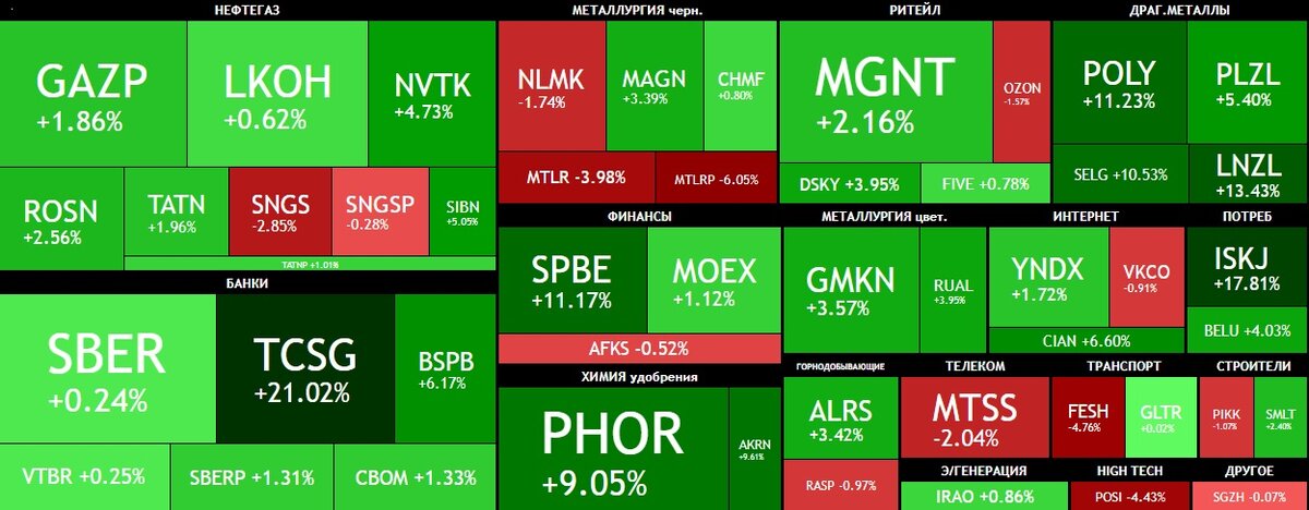 Очередная неделя на фондовом рынке завершилась, наступила новая. Давайте посмотрим на результаты прошлой недели, посмотрим на лидеров роста и лидеров потери стоимости, среди российских компаний. Посмотрим на более привлекательные акции российских компаний, а также обратим внимания на самые значительные события недели. Итак, начнём... Карта рынка Начнем по традиции с карты рынка, на которой видна вся динамика стоимости по акциям российских компаний. Если цвет красный - это просадка, если цвет зеленый - это рост стоимости. Чем темнее оттенок - тем существеннее значение... Если смотреть поверхностно, то в целом рынок показал положительную динамику, за исключением нескольких компаний. Давайте и начнем с них, посмотрим на лидеров падения стоимости. Акции российских компаний - лидеры снижения стоимости Если смотреть на лидеров снижения, то список выглядит так: Если смотреть по отраслям, то снижение наблюдается как по металлургам, так и по нефтяникам, также удивили акции компании