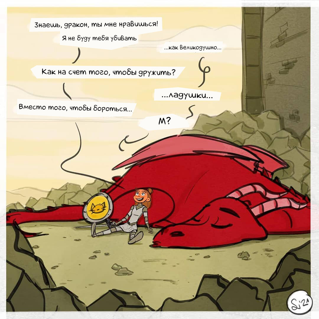 Мне определенно все больше и больше нравится юмор в этой серии комиксов! В последние дни мне стало все сложнее писать статьи, если честно. Из-за того, что авторы комиксов мало о себе рассказывают, а я публикую их серии комиксов, то в какой-то момент мне больше нечего о них рассказать. А про себя я и так слишком много говорю. К тому же, в моей жизни мало что происходит чего-то нового: работа, вторая работа, тренировки, чтение, учеба... и так по кругу. Периодически выбираюсь куда-то с подругами. И если там оказывается очень красиво, то делаю ролик для канала. Единственное что, я бы наверное хотела бы попробовать вступить в "Лиза Алерт", так как уже давно хочу. Однако, моё расписание отчаянно против. Все таки там придется часть выезжать куда-то ночью на поиски или срываться от дел. Но хочу. Очень! И как же без игры? Правда сегодня она опять будет немного другая, чем обычно. Вам необходимо в комментариях загадать какой-нибудь очень знаменитый фильм, но описать его нужно с помощью смайлик