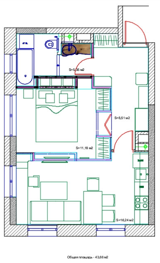 С самого начала, данная квартира была куплена как инвестиционный проект (под сдачу в аренду). Но планы поменялись, и пришлось проектировать квартиру для себя. Проект После того как владельцы получили ключи от квартиры, они сразу же принялись за проектирование и ремонт. Так как квартира сдавалась от застройщика без какой-либо отделки, проект делали с чистого листа. Одним из существенных плюсов данной жилплощади - это наличие аж пяти окон. Прихожая Вся прихожая выполнена в максимально светлой цветовой гамме с яркими цветовыми акцентами. Справа от входа появился встроенный шкаф с прозрачными дверцами. У стены расположился яркий пуф с большим зеркалом. Кухня-гостиная Напольное покрытие во всей квартире единое - наливные полы. Стены покрашены в белый цвет. Слева при входе установили кухонный гарнитур. Нижние фасады глухие и выполнены в сером цвете, а верхние - решетчатые и имеют более темный цвет. Под потолком находятся антресольные секции. У окна расположилась столовая группа, которая виз