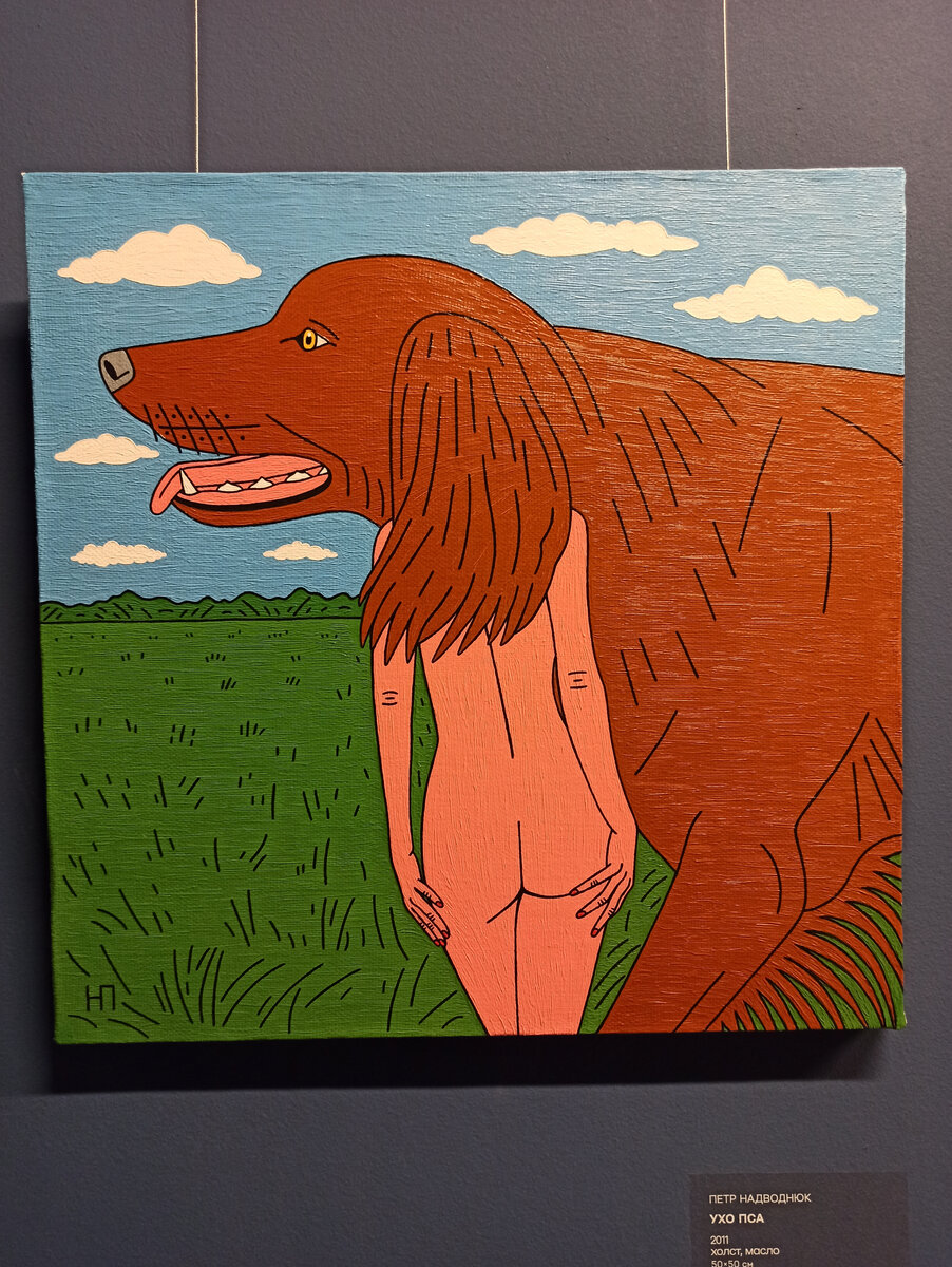 С этой строчкой из песни предлагаю снова погрузиться в живописный сюрреализм, абсурд и гротеск! Сегодня посмотрим картины Петра Надводнюка, выставка которого проходила в музее Эрарта. Художественный стиль автора очень узнаваем: яркие чистые цвета без сложных смесей, ровные заливки, тонкий черный контур объектов и фантастические сюжеты, построенные на ассоциациях. Чаще всего совмещение объектов построено на элементарном внешнем подобии, но иногда это совершенно абсурдные находки. Что и есть самое интересное! Картины этого художника являются то ли сказочными иллюстрациями, то ли коллажами из журнальных вырезок, перерисованных в масле на холсте. Но в любом случае это оригинальные и забавные произведения, заставляющие зрителя улыбнуться или задуматься. Иной раз не совсем понятно, что же натолкнуло автора на такие сочетания несочетаемого. Лепестки цветка превращаются в рыбную чешую, тут можно проследить мысль, но кузнечик...вы сами видите) Так что в жизни всегда есть место удивительному. Пр