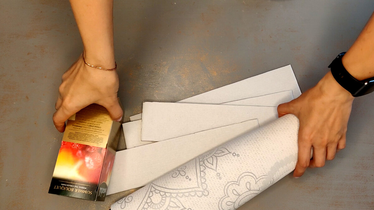 Приветствую всех кто заглянул на мой рукодельный канал. Хочу поделиться с вами интересной идеей из коробки от чая, которые обычно все выкидывают, но я люблю творить своими руками и всегда переделываю в полезные мелочи для дома. Итак, нам нужна небольшая коробка от чая. Обрезаем верхушку, а все края скрепляем малярной лентой или клеем. Следующим этапом обклеиваем всю коробку остатками обоев. Я взяла небольшие отрезки из картона по ширине равные коробке, а длинна должна быть немного больше чем сама коробка. Обклеиваем другим оттенком остатков обоев, либо можно использовать обычную газету или бумагу, а после покрасить. Таких нам надо четыре одинаковых заготовки. Придаём в двух местах изгибы как на фото ниже: Присоединяем с помощью горячего клея к коробке от чая со всех сторон. Получается такая конструкция как на фото ниже: Следующим этапом сделала из атласной ленты бант и присоединила его к нашей поделке. Получилась красивая и практичная ваза для цветов. Если внутрь поставить банку с водо