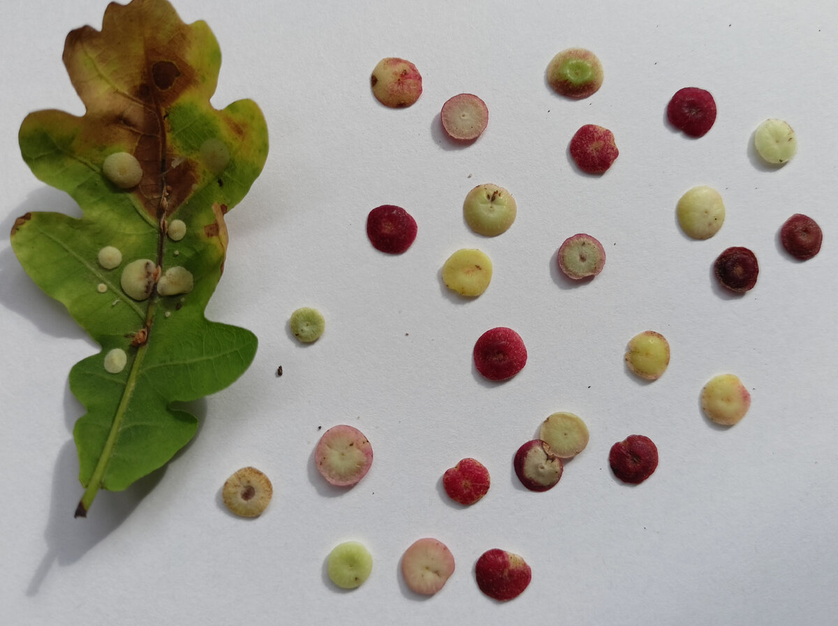 Богатство дубов. На листьях некоторых дубов можно встретить небольшие округлые пятнышки. Особенно много с южной стороны дерева. Если внимательно присмотреться - окажется, что эти пятнышки на самом деле маленькие дископодобные галлы. Причина появления этих галлов - маленькая Ципидная Оса , которую еще называют Neuroterus quercusbaccarum, или Орехотворка Виноградная. Самка этого насекомого откладывает яйца на нижнюю, более нежную сторону дубового листа, прокалывая кожицу, или эпидермис, специальной иглой-яйцекладом. По этой причине Орехотворку и назвали Осой. На одном листе может появиться до 100 галлов. Каждый такой диск-галл является домом для одной личинки Орехотворки. Появившаяся в толще листа личинка выделяет вещества, запускающие биохимический механизм , влияющий на рост растительных клеток. (Этот механизм до сих пор не изучен). Ткань листа начинает создавать дискообразный отросток, дающий защиту и питание находящейся внутри личинке. Интересно, что по мере роста личинки, про