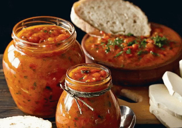 Его подают в качестве закуски к мясу и овощам, а также используют, как намазку на бутерброды. 5 кг красного сладкого перца, 8 баклажанов среднего размера, 2 кг спелых красных помидоров, 2,5' ст. растительного масла, соль. Все овощи вымойте. Перец и баклажаны обожгите над плитой (газовой), чтобы кожица потемнела. (Складывайте горячие обожженные овощи в кастрюлю с плотно закрывающейся крышкой - так их потом будет легче чистить.) Очистите баклажаны от кожицы,а перец - от кожицы, плодоножки и семян. Пропустите вместе с помидорами через мясорубку, посолите по вкусу, сложите в кастрюлю с антипригарным дном и варите до загущения. Влейте масло и держите на огне, пока масса не станет совсем густой (проведите деревянной лопаткой по дну кастрюли: если след долго не исчезает, можно консервировать). Простерилизуйте банки, разложите в них горячую пасту и закатайте. #соусрецепт