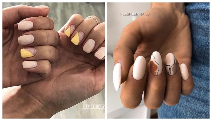 Маникюр — это обязательная косметическая процедура, без которой крайне сложно будет выглядеть ухожено и благородно. Оставайтесь с нами, в этой статье мы с вами рассмотрим самые актуальные идеи маникюра этого сезона. На данный момент есть огромное количество актуальных дизайнов, которые удовлетворят потребности, как бунтарки, так и девочки паиньки. Первый необычный и достаточно эффектный дизайн — это произвольная абстракция. Нейл мастера выполняют его на молочном полотне, используя для прорисовки отдельных элементов яркие цвета, а иногда, даже и фольгу. Перед вами следующий эффектный дизайн маникюра, включающий в себя абстрактные изображения, а также анималистичные элементы. На нюдовом лаке лучше всего видны именно рисунки черного цвета. Абстракция с тенями, колоритными переходами от одного к другому оттенку + нюдовый фон — идиллия, которая делает женские ручки ухоженными и привлекательными. Многогранный дизайн «мрамор» — отличный вариант, который подходит, как на каждый день, так и дл