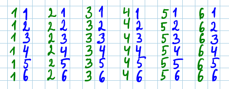 Одной из классических задач по теории вероятностей является вопрос о вероятности некоторого события при двух бросках игрального кубика Одним из надежных способов решения является использование схемы случаев В каждом столбике: первой число - это количество очков, которое выпало на первом кубике (зеленый кубик), а второе число - количество очков, которое выпало на втором кубике (синий кубик) Схема случаев и решение совпадают, если бросать два кубика одновременно или два раза бросать один кубик