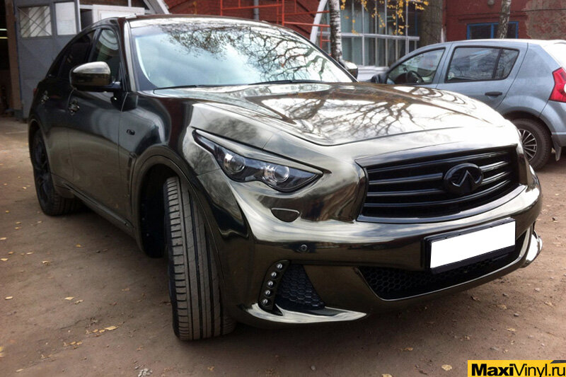 На этот раз мы выполнили, без преувеличения, очень сложную работу по оклейке автомобиля Infiniti FX. Заранее мы не могли и предположить, что этому авто настолько подойдет этот цвет. Но этому есть своё объяснение. Так как этот Финик очень округлый, широкий и низкий для джипа, то создаётся ощущение слегка завышенной легковушки. А почти каждой легковой машине хром к лицу. Но одним хромом не обошлось, поверх него мы наклеили витражную пленку фирмы Hexis, которая и создала эффект черного хрома. Конечно самое трудоемкое при оклейке данного авто было то, что на машине установлен обвес. Название материала: зеркальный хром Nippon + витражная пленка Hexis