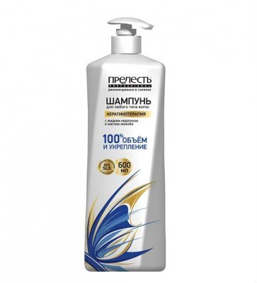 Это выгодный шампунь – большой объемом 600 мл продается по цене 330-400 рублей. Да и выглядит упаковка интересно, в каком-то профессиональном стиле, необычной формы с удобным дозатором. Предназначен шампунь для тонких, поврежденных, ломких волос. Пользователям обещано их восстановление, глубокое питание, укрепление, блеск и объем, облегчение расчесывания. Состав средства не безупречный, но и не самый плохой.
