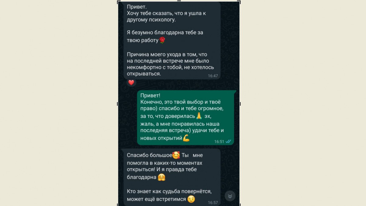 Получила свежий отзыв о работе с клиенткой и скажу честно: я в восторге, когда клиенты находят в себе силы (или что-то другое), чтобы не просто уйти в закат, а написать специалисту, с которым работали. А если еще и укажут на причину такого решения, то это вообще невероятно! Скриншот сделан и размещен с разрешения клиентки В начале практики у меня видимо было много свободного времени на фантазии о том, почему же клиент ушел / не пришел / не пошел дальше. Ооо, никакой отрицательный отзыв клиента не сравнится с теми помоями, которые начинающий специалист выливает на себя. И с теми чувствами, которые появляются в результате этого. И с той работой, которую приходится проделывать. А здесь все ясно и понятно: мы действительно очень эффективно работали, а на последней консультации было очень остро, но искренне! Могла бы я вести себя иначе? Да. Осталась бы клиентка в работе? Да. Было бы это полезно для клиентки? Нет. Обратная связь полезна в любом случае, даже если она отрицательная. Иногда это