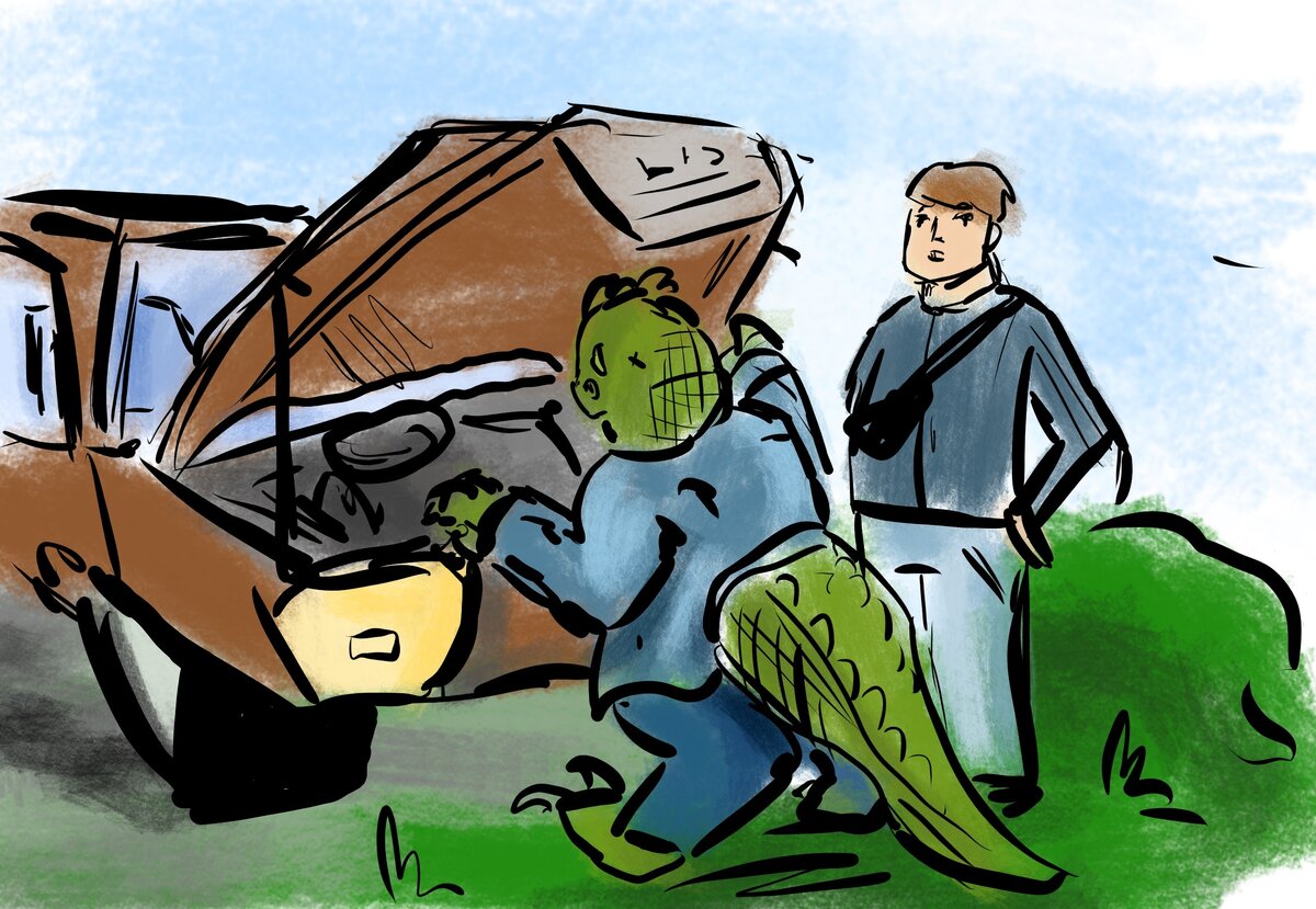 Первое время он вообще не думал, просто выполнял какие-то простые действия при ремонтах, о которых его просили, а потом стало так плохо получаться что он превратился в человека-радио и просто развлекал всю компанию весёлыми историями, пока они работали над своими первыми автомобилями.