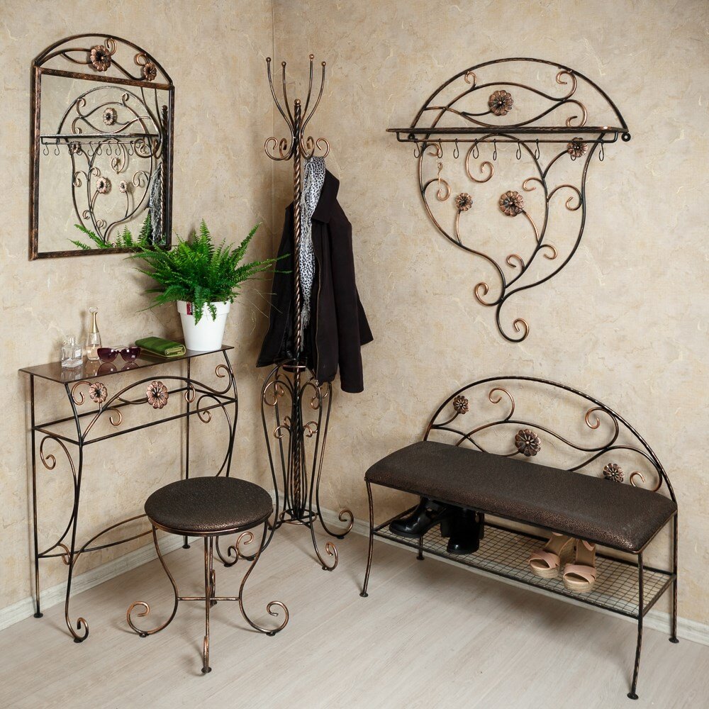 Когда приходит время обновить интерьер, многие ищут оригинальные идеи оформления, чтобы сделать свой дом не просто красивым, но и уникальным. Одним из беспроигрышных вариантов, позволяющих осуществить это, является использование в отделке художественной ковки. Она будет уместна в любой комнате - столовой, спальне, гостиной. Большой популярностью в последнее время пользуются кованые прихожие. Использование художественной ковки в оформлении подразумевает сочетание эстетики и практичности. Кованые конструкции надежны, долговечны. Они прекрасно вписываются в любой стиль интерьера, выглядят стильно и благородно. Могут быть изготовлены в любых размерах и конфигурациях. Преимущества Кованые изделия имеют ряд преимуществ по сравнению с предметами мебели из других материалов: Помимо этих преимуществ, кованая мебель обладает еще одним очень важным плюсом. Благодаря тому, что изделия имеют сквозную конструкцию, они выглядят более воздушными и визуально не загромождают пространство. Ковка позволяе
