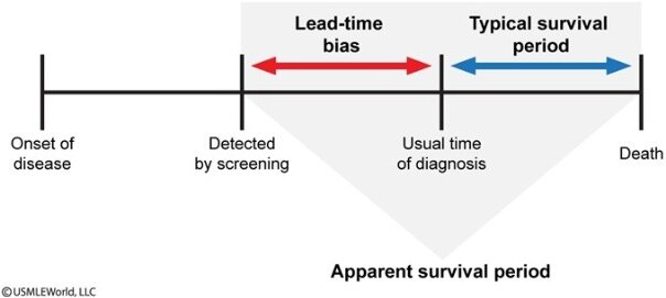 (Choice B) Lead time is the time between the initial detection of a disease and a specific outcome or measured endpoint. Lead-time bias can occur when a test detects or diagnoses the disease at an earlier stage than another test without impacting the natural history of the disease. A study comparing disease survival times may then erroneously conclude that using the earlier-detection test prolongs survival, when in actuality the increased survival time is due solely to earlier detection of the disease.