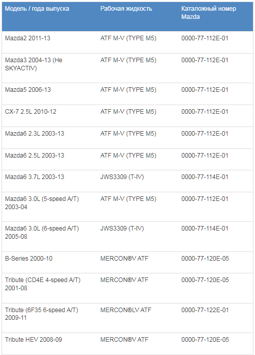 • ATF M-V (Тип M5) имеет лучшие антизадирные характеристики, чем MERCON®V и MERCON®LV ATF Обратитесь к таблице, чтобы определить жидкость для автоматической коробки передач вашего автомобиля Мазда, если он был выпущен в период с 2001 по 2013 гг. и не является автомобилем SKYACTIV-ной технологии. Цены на правильную жидкость для автоматических трансмиссий вашей Мазда и на работы по ее замене в Ниппон Сервис вы можете уточнить у наших специалистов по телефону: +7(495) 001-05-21