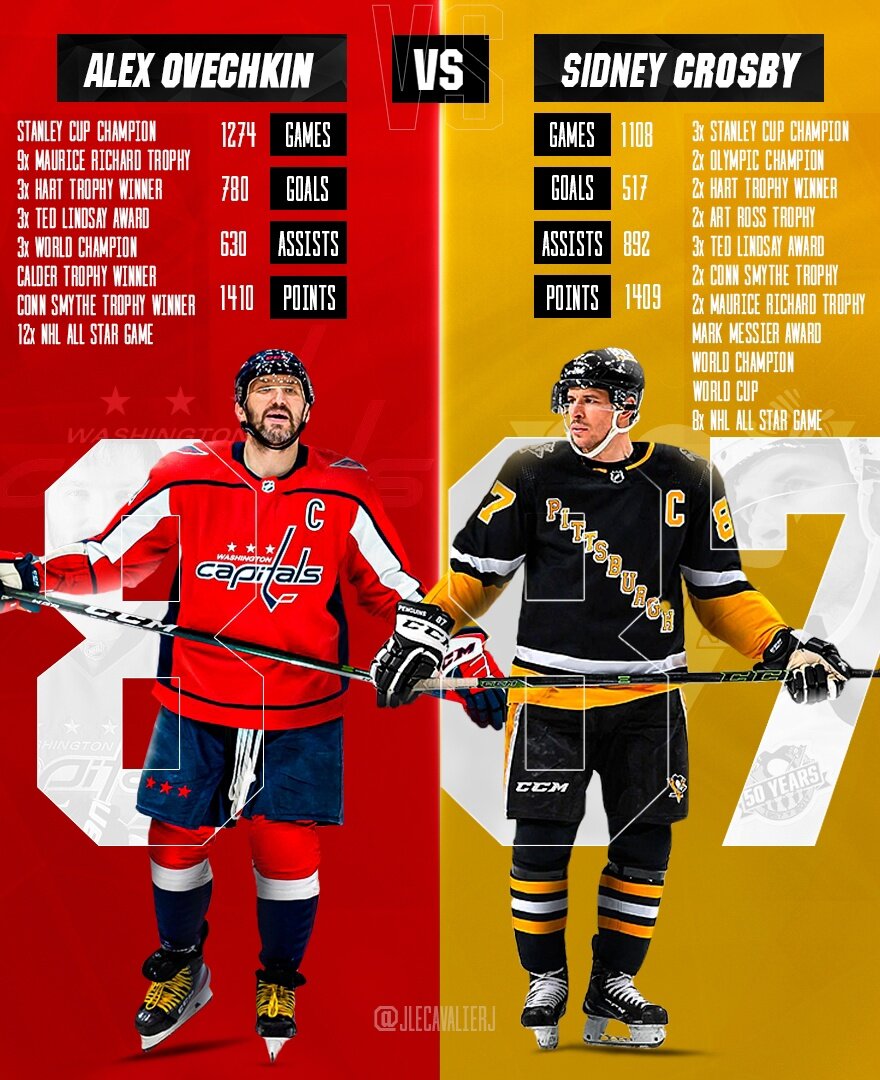 Первые номера разных драфтов (2004 и 2005), но из-за локаута карьера обоих стартовала одновременно с сезона 2005/06, с которого и началось главное противостояние личностей такого информационного масштаба как минимум современной эпохи хоккея. И спустя 17 сезонов в гонке по очкам у них практически равенство – 1410 (780+630) против 1409 (517+892) в пользу «Великой Восьмерки».Оба игрока собрали массу индивидуальных наград: Кросби получил на один Арт Росс и Конн Смайт больше, но у Овечкина больше на один Харт и 7 Морисов, а еще он является единственным за всю истории лиги собственником уникального набора трофеев (колдер-харт-арт-тед-морис-конн смайт). В общем количестве индивидуальных наград Овечкин делит второе место с Супер-Марио (по 18), хотя половина это Морисы. Зато в командных наградах однозначный перевес у Кросби – 2 олимпийские золотые медали, кубок Мира и солидные 3 кубка Стэнли, что делает его членом «элитного тройного золотого клуба». Ови лишь единожды поднял над головой заветную Чашу, а российская сборная на олимпиадах приносит нам только горечь и страдания, ограничиваясь успехами только в рамках чемпионатов мира – зато 2 полных комплекта всех медалей и итоговые 3 золота.
