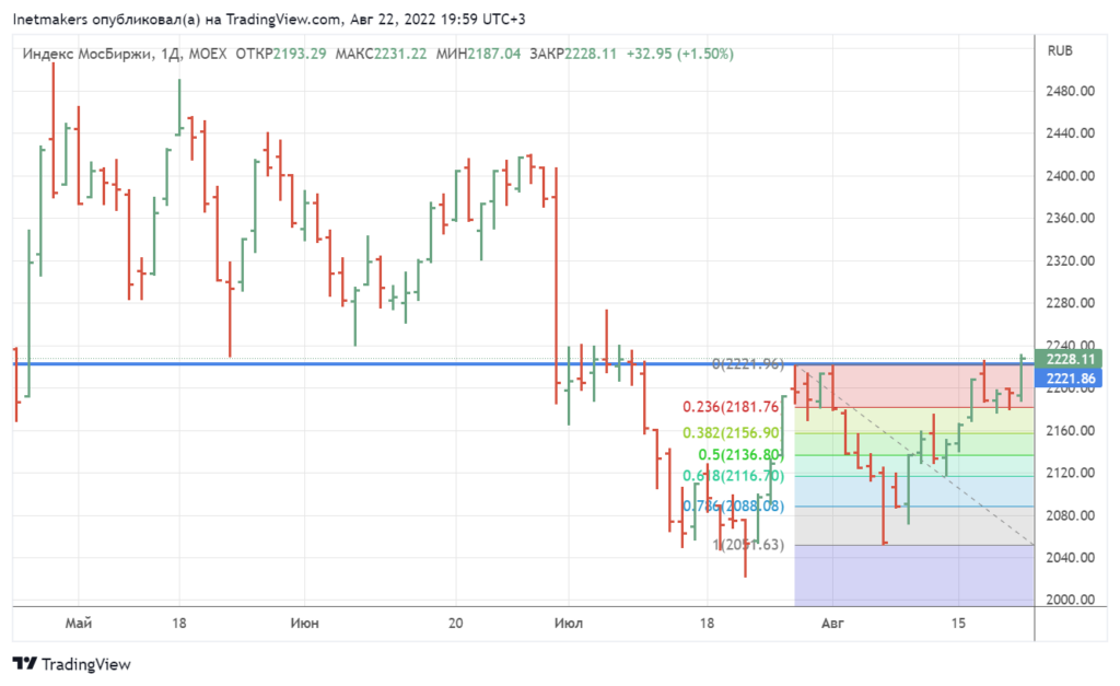 22 августа российские акции показали рост, индекс МосБиржи поднялся на 1,5% до уровня 2228,11. Итак сегодня рынок показал себя очень хорошо, сумев пробить ключевое сопротивление, которое мы обозначаем синей линией. Сегодняшний тренд на рост проявил себя практически в самом начале торгов, что подвигло нас на совершение покупок, в результате наш портфель теперь вновь заполнен на 100%. Если индекс Московской биржи сможет завтра удержаться выше уровня синей линии — это будет означать окончательный пробой сопротивления с открытием перспектив роста до уровня 2400. Сегодня акции Газпрома выросли на 2,13%, Сбербанка на 0,69%, а Лукойла на 1,13%. Индекс FTinvest.ru поднялся на 0,62% до 360,64 пунктов. Американская валюта выросла на 1,3% и стоит 59,87 руб., в результате сформировалась модель роста доллара, что хорошо и для акций: Нефть WTI падает на 0,66% до $89,78 за баррель, а Brent на 0,78% и стоит $96,64. Золото сегодня ниже на 0,71% и стоит $1734,93 за тройскую унцию. Биткойн падает на 1% д