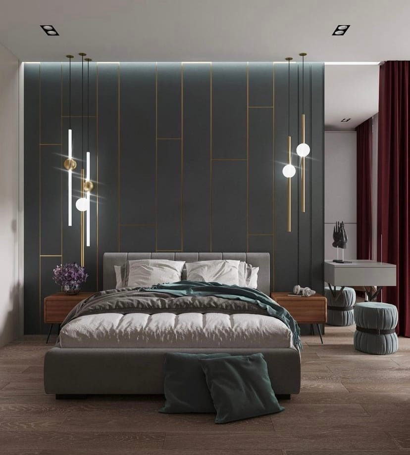 Характер комнате задает акцентная стена, которая создает тональность помещения. Цветовая гамма спокойная, глубокая — это именно то, что нужно, чтобы расслабиться и почувствовать себя дома. Для того, чтобы сделать помещение просторным, но при этом функциональным, мы ставим увеличенный в глубину шкаф. Он выполняет роль минигардеробной, в которую можно поместить все необходимое, но при этом, внешне он не привлекает внимание и не занимает пространство. Обратите внимание на необычный туалетный столик. Он выполнен в минималистичном стиле, не занимает место, даже служит декором. А дополнительный шкафчик мы замаскировали за колонной.