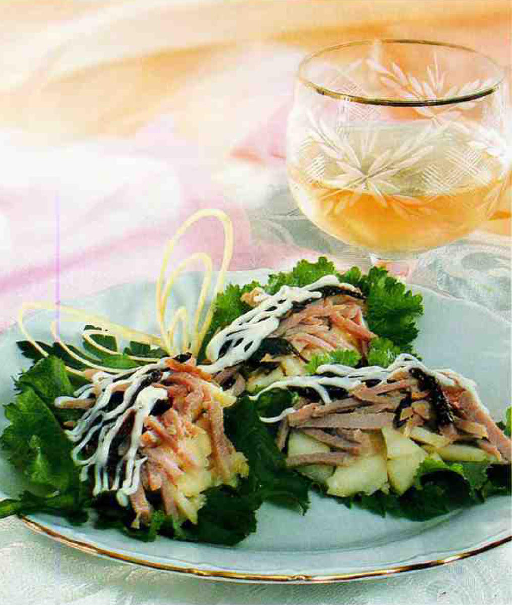 Для приготовления салата нам понадобится: На 4 порции: Готовить салатик из индейки: Филе индейки тонко нарежьте. Чернослив ошпарьте и выньте косточки. Яблоки очистите от ножицы и сердцевины и нарежьте ломтиками. Подготовленные продукты уложите на листья салата, посолите, заправьте майонезом и оформите зеленью. Салат Лето Для приготовления 1 порции нам понадобится Приготовление: Овощи и отварной картофель нарезают тонкими ломтиками, лук шинкуют, зелень мелко режут. Все перемешивают, солят и заправляют сметаной. К сметане можно добавить соус «Южный» со специями. Часть овощей и сваренное вкрутую яйцо желательно оставить для украшения готового салата. Популярность русской кухни во всем мире необычайно широка. Русская национальная кулинария прошла чрезвычайно долгий путь развития, отмеченный несколькими крупными этапами, каждый из которых оставил свой след до наших дней.