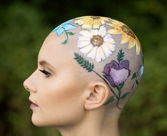 Лысенькой я хожу с июня. Волосики полетели после первого курса "красной химии". Честно говоря, мне уже поднадоела лысая головушка, но химиотерапевт сказала, что полноценные волосы начнут расти примерно через два месяца после окончания полного цикла "химии". А мне назначено восемь курсов... Хотя, справедливости ради, отмечу, что сейчас на голове у меня "живёт" пушок. Пух начал расти после четвертого курса и достиг примерно 0,7-1 см. Чтобы не грустить понапрасну, я решила посмотреть в интернете, как прикрывают лысые или "пушковые" головы в европейских странах. Они же затейники, без комплексов... И нашла классные фотки. Они их не прикрывают, а "обыгрывают". Делюсь!!! Акварельная цветочная поляна... Нежная голубая клумба... Сочная клубничка... Цветные рожицы... Куда же без сердечек... А вот и более жесткий - звериный принт... И вновь милота - пчелки-труженицы... А это чудесное фото вызвало у меня слёзы. Скорее всего, девочка на фотографии - пациентка онкоцентра. Кто-то из творческих добр