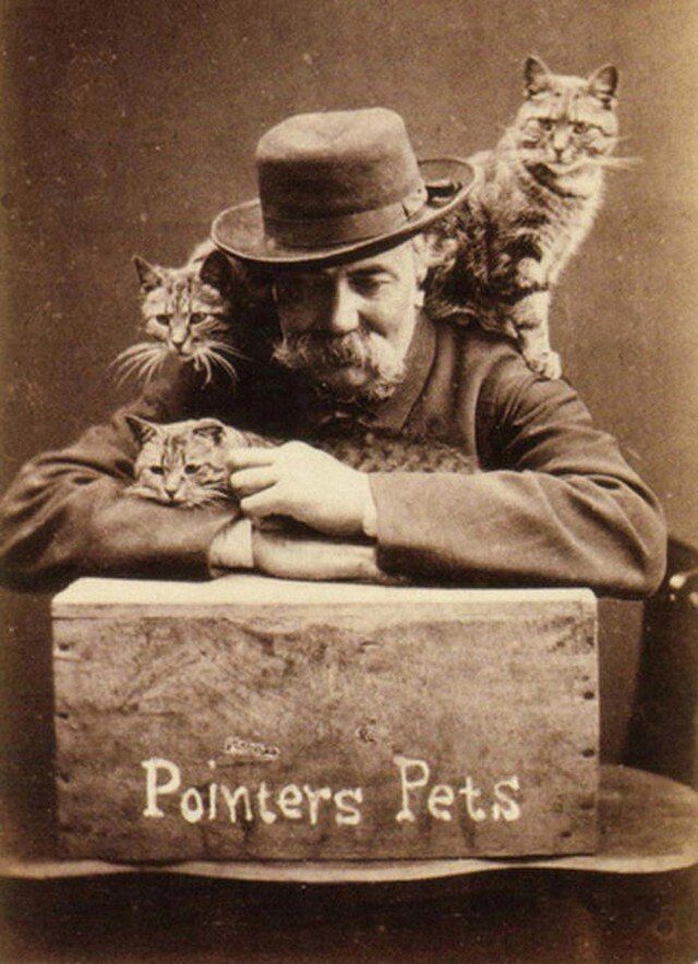 Я неоднократно уже рассказывал на своём канале о том, как непрост был труд первых фотографов. Он непрост и сейчас, если мы говорим о профи, но сегодня речь пойдёт всё же о фотомастерстве в историческом разрезе. Парочку ссылок по теме, конечно, оставлю для вас внизу, но вкратце скажу, что одной из проблем фотографов прошлого была длинная выдержка. То есть то время в течении которого делается кадр. Сейчас это сотые доли секунды, а когда-то для получения фотоизображения нужны были минуты! И всё это время модель должна была стоять/сидеть абсолютно неподвижно. В противном случае портрет получался смазанным. Отчасти именно этим объясняется то, что на большинстве старинных фото люди даже не улыбались. Так вот, при всём при этом, некий британский фотограф по имени Гарри Пойнтер умудрился снять целую серию комичных фотографий со своими кошками! Забавно, что узнал я про Пойнтера и его котофото, увидев его имя рядом со снимком, который он не делал. Всё говорит нам о том, что этот кадр сделан не