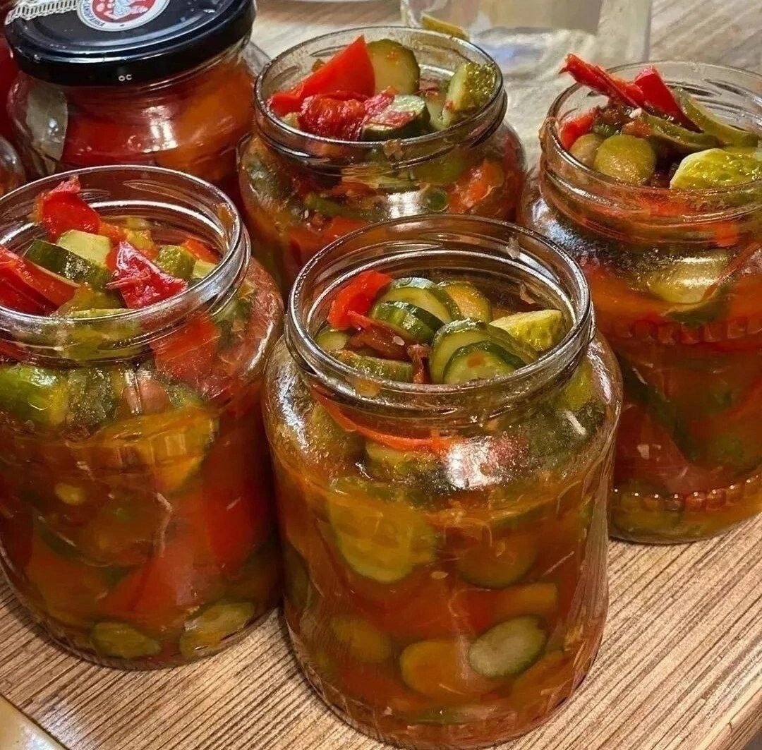 Ингредиенты: - Огурцы - 1 кг - Помидоры - 0,5 кг - Болгарский перец - 300 грамм - Сахар - 90 грамм - Соль 40 грамм - Растительное масло 50 грамм - Уксус 9% 50 мл - Чеснок 2-3 зубчика Изготовление: 1. Помидоры прокрутить через мясорубку или в блендере и вылить в кастрюлю. 2. Болгарский перец очистить помыть и нарезать. 3. В кастрюлю с томатной массой добавить перец, сахар, соль, растительное масло и чеснок пропущенный через пресс. 4. Перемешать и поставить на огонь и довести до кипения, уменьшить огонь и варить 10-15 минут. 5. Высыпаем огурцы, вливаем уксус, перемешиваем. 6. Доводим до кипения, потом огонь уменьшаем, накрываем кастрюлю крышкой и готовим 5-6 минут. 7. Готовое лечо с огурцами, помидорами и перцем разливаем по горячим стерилизованным банкам и закручиваем крышками. 8. Переворачиваем банки вверх дном, укрываем чем нибудь теплым и оставляем до полного остывания. Приятного аппетита!!!! #заготовкиназиму #лечо #вкусноипросто