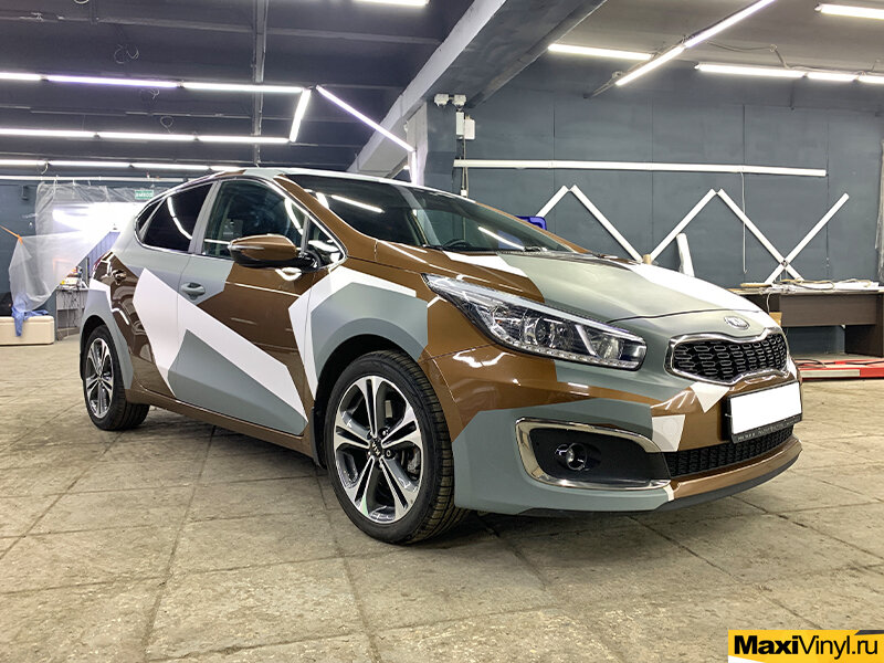 К нам обратилась клиентка на автомобиле Kia Ceed с целью восстановления наклеек в виде камуфляжа. Нами была подобрана серая и белая матовые плёнки в соответствие с тем, что уже было наклеено ранее. На машине были оклеены следующие детали: передняя правая дверь, дверь багажника, частично переклеены детали на крыше, капоте и заднем бампере, также были проведены мелкие восстановительные работы по наклейкам в виде их подрезки. Название материала: KPMF 88 000