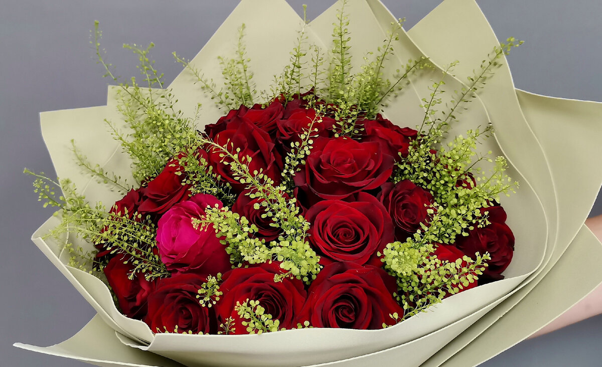 Заходит ко мне очень интеллигентная дама, искала белые розы с запахом. К сожалению, у нас не было их в наличии. Она спросила какие у нас есть цветы с приятным ароматом. Я предложила фрезию и матиолу... В этот день в холодильнике у нас стояли шикарные эквадорские красные розы сорта Explorer. Дама посмотрела на них и говорит: "Такие розы только на грышку гроба! Неужели вам они нравятся?" Я деликатно ответила, что люблю все цветы, и эти розы, мне кажется, очень хороши. В итоге, женщина ушла ни с чем. А у меня в голове всё крутилась фраза "на крышку гроба", "на крышку гроба"... Стало даже обидно за мои розочки. Забавно, что именно в этот день, буквально перед закрытием, зашли два брата и попросили собрать букет из 25 роз, и выбрали именно те самые красные розы! Оказалось, что их было 24 и было принято решение как вишенку на торте добавить одну фиолетовую розу. Братья отметили, что они обошли всё в округе, и у нас оказалась самая лучшая красная роза, да ещё и по привлекательной цене. Вот т