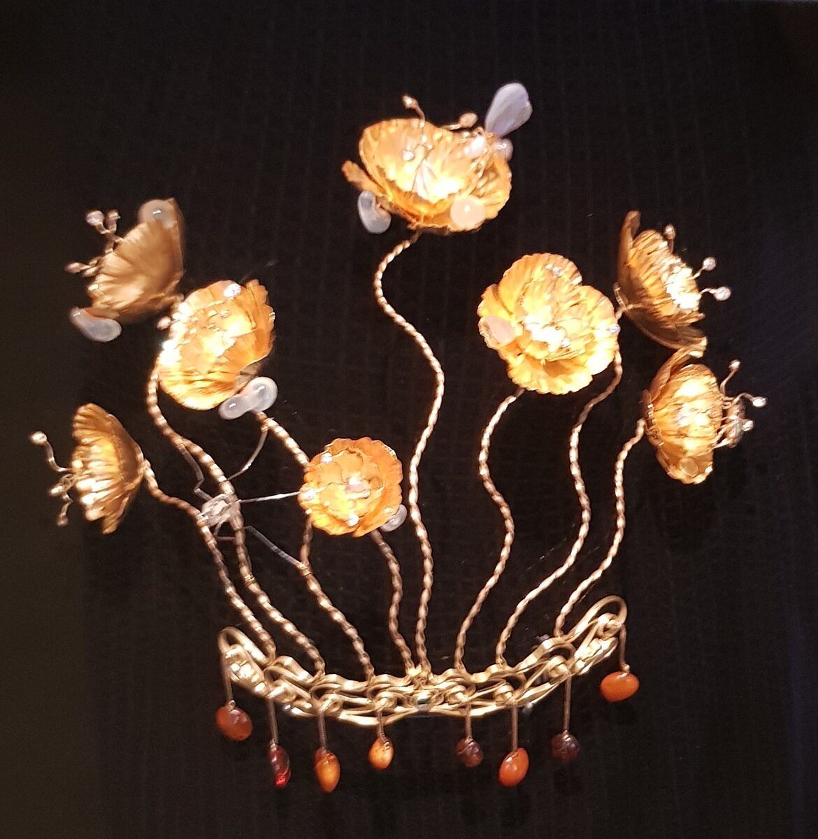 Хотя мастер назвал его диадемой, но это украшение ближе к тиаре - украшению для волос. Маки из золота, украшенные жемчугом, аквамарином и лунным камнем не должны торчать над волосами, как уши инопланетянина. Они вплетаются в укладку таким образом, что на голове образуется "маковое поле".