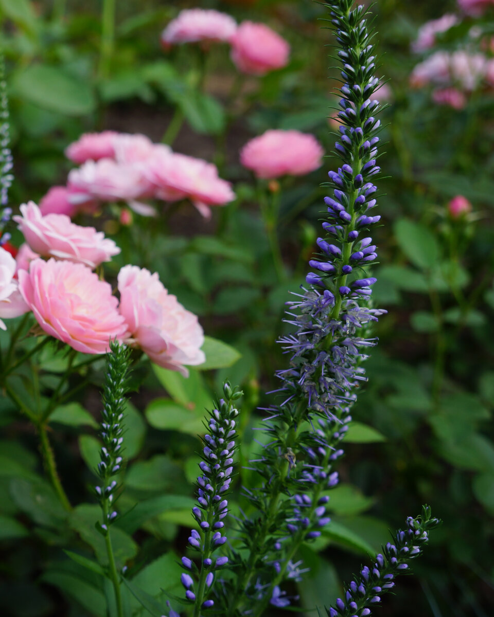 Вторую волну цветения, розы продолжают уже не одни. Вместе с ними и рядом с ними цветёт Вероника. Весной, посеяв семена Вероники, я не ожидала, что эти многолетники зацветут в первом своем сезоне. Семена я посеяла на рассаду в стаканчики в апреле. Взошли они дружно. С одной упаковки семян получилось очень много рассадного материала. Порциями распикировала и раздала по знакомым. Было приятно, что все принимали рассаду цветов с удовольствием. Многим по душе эти голубые стройные колоски. Свежее дыхание в жаркие дни Повторно розы начали своё цветение в конце июля. В это время был пик высоких температур. Сохранить декоративность розовым кустам было сложно и всё же они цвели. Рядом с розовыми кустами ещё весной я высадила рассаду Вероники, а к августу она зацвела. Для роз это была приятная поддержка. Стройные соцветия - стрелы Вероники стали дружно расти вверх. Голубой цвет оживил композиции роз и внёс свежее дыхание в розарий. Весь август Вероника выпускает новые порции молодых ст