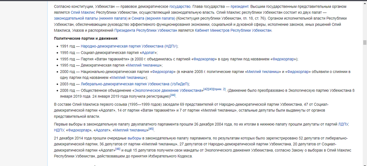 Часть 2 Современный Узбекистан по Вики: Узбекистан — правовое демократическое государство. Глава государства — президент. Высшим государственным представительным органом является Олий Мажлис Республики Узбекистан, осуществляющий законодательную власть. Олий Мажлис республики Узбекистан состоит из двух палат — законодательной палаты (нижняя палата) и Сената (верхняя палата) (Конституция республики Узбекистан, гл. 18, ст. 76). Органом исполнительной власти Республики Узбекистан, обеспечивающим руководство эффективного функционирования экономики, социальной и духовной сферы, исполнение законов, иных решений Олий Мажлиса, Указов и распоряжений Президента Республики Узбекистан является Кабинет Министров Республики Узбекистан. многопартийное: многонациональное: многоконфессиональное: По официальным данным на 1 июня 2010 года в Узбекистане были официально зарегистрированы 2225 религиозных организаций 16 различных религиозных конфессий[65]: Как видим вполне себе такое светское государство. Мо