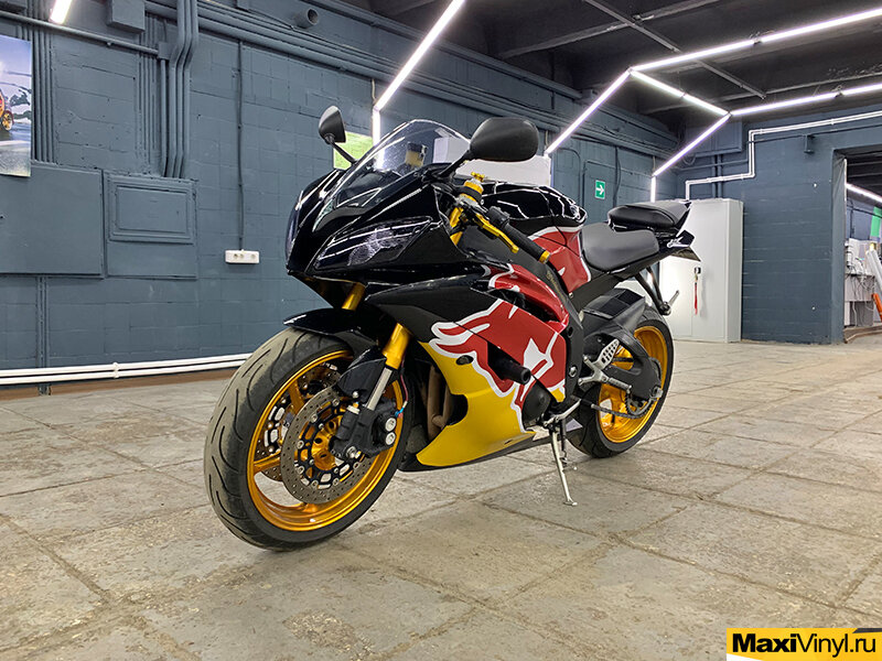 К нам обратился клиент с целью изготовления макета и наклеек в стилистике логотипа энергетического напитка Red Bull. Нами был разработан дизайн, произведена печать с ламинацией и оклейка мотоцикла Yamaha R6. Также на данном мотоцикле мы затонировали передние фары полиуретановой плёнкой. Сочетание красного цвета с жёлтым и черным смотрится очень гармонично и изображение быка из фирменного стиля Red Bull значительно добавляет агрессивности и динамики мотоциклу. На наш взгляд, теперь мотоцикл смотрится гораздо более оригинально и выделяется из потока остальных мотоциклов в Москве. Название материала: Oracal Orajet 3951