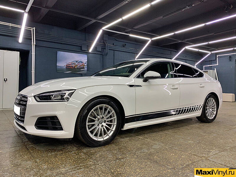 К нам обратился клиент на автомобиле Audi A5 белого цвета с целью придания ему индивидуальности. В частности, клиент захотел разместить полосы на своем замечательном автомобиле. Нами был изготовлен макет, наклейки и они были наклеены на автомобиль. Также владелец машины захотел забронировать фары защитной полиуретановой плёнкой Neverscratch, что нами и было сделано. Название материала: Oracal 551