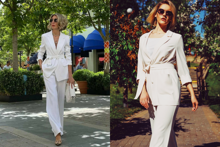 - Наряд для особого случая. Летом нет ничего лучше, чем белый жакет. В дополнении свободные брюки и туфли, но можно и кроссовки, кеды, босоножки, балетки.