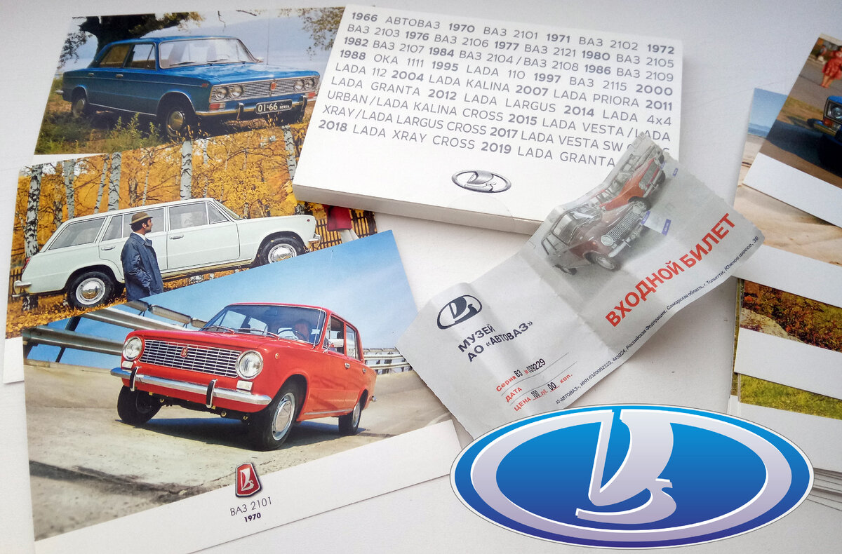 Этим летом проездом побывал на заводе АО "АВТОВАЗ", в музей которого специально заехали по пути из Самары в Ульяновск. В магазине сувениров и купил этот набор открыток, посвящённых продукции завода. Набор очень качественный - открытки плотные (практически картон), печать яркая и чёткая, без муара, хотя изображения явно даны с рекламных плакатов тех лет. Отпечатаны в типографии "Двор печатный АВТОВАЗ" города Тольятти. Сам музей очень понравился - множество экспонатов всех серийных автомобилей, включая прототипы. От самых первых моделей до самых современных. Билет в музей стоит всего 100 руб. Открытки обошлись в 300 с небольшим. Познакомлю вас с открытками и, заодно, с экспонатами с этих открыток, которые стоят в музее. Буду придерживаться хронологии. 1970 Легендарная "копейка", с которой началась история АВТОВАЗА. Все фото мои. На первом плане Fiat 124 - прототип "копейки", затем - ВАЗ 2102 и 2103. 1971 1972 1976 Шильдики разных моделей АВТОВАЗА. 1977 Семейство "Нив". 1980 1982 1984 198