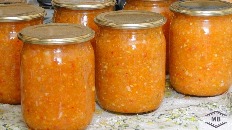 Проверенный рецепт аджики таёжной из летнего урожая кабачков, томатов, перцев и моркови! Аджика таёжная в меру острая, подходит как соус для мясных блюд и как добавка в супы и горячие гарниры. Ингредиенты: 3 кг кабачков, 1,5 кг томатов, 0,5 кг моркови, 0,5 кг перцев болгарских, 4 головки чеснока, 3 шт перцев острых чили, 2 столовые ложки соли, 200 мл растительного масла, 100 грамм сахара, 100 мл уксуса. Процесс приготовления: Томаты промываем, режем кусками и пропускаем через мясорубку. Также через мясорубку пропускаем очищенные морковь, перцы и кабачки. Ставим овощную смесь на плиту и доводим до кипения. После закипания массы, варим 40 минут на среднем огне. Периодические помешиваем массу, чтобы не пригорала. Добавляем чеснок, пропущенный через пресс и солим. Всыпаем сахар, масло и уксус. Перемешиваем и варим 10 минут. Раскладываем аджику по стерилизованным банкам и закрываем стерилизованными крышками. Банки переворачиваем и укутываем махровым полотенцем. После остывания банок с