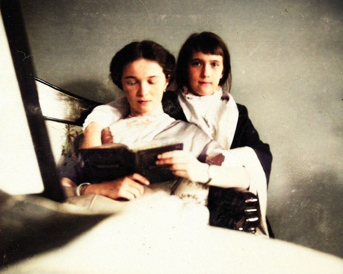 Одно из самых уютных и домашних фотографий, Великая княжна Ольга читает книгу, а Великая княжна Анастасия смотрит прямо в кадр, а значит и на нас с вами. Великая княжна Анастасия в домашнем халате, на правой рук у нее часы, носила она их чаще других сестер. У каждой из Великих княжон были свои особенности характера, например Ольга была вспыльчива, Анастасия с неподражаемой точностью могла изобразить любого человека и часто была неуправляемой, но кто из нас без недостатков? В основе у всех пятерых детей Николая 2 было чистое, доброе сердце. Что подтверждает одно из воспоминаний: «Великая Княжна Ольга, говорили, была похожа на Государя. Не знаю. При мне Государь ни разу не приезжал в лазарет: он был на фронте. Но если Великая Княжна Ольга была похожа на Государя, то синие глаза Княжны говорили о том, что Государь был человек исключительной доброты и мягкости душевной.