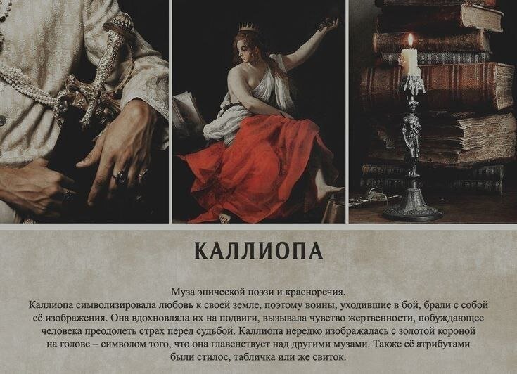 Старшая из детей Зевса и Мнемозины. Античный поэт Дионисий Медный назвал поэзию «криком Каллиопы».