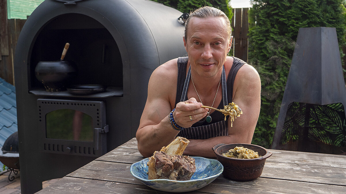 Предлагаю вам простой и доступный рецепт говяжьей голяшки с капустой, приготовленной в русской печи. Блюдо очень вкусное, сытное и вы влюбитесь в него навсегда, как только попробуете. Блюдо можно приготовить и в духовке, но печь делает его намного вкуснее. Ингредиенты: Приготовление: Дно чугунка выстилаем тонко нарезанным курдючным жиром, сверху кладем голяшку и вокруг голяшки распределяем квашеную капусту. В чугунок наливаем немного жидкости, в которой квасилась капуста. Шинкуем свежую капусту, мелко нарезаем сельдерей и стебли укропа. В чугунок отправляем чеснок и нарезанный полукольцами лук. Смешиваем зелень с нарубленной капустой и отправляем следом в чугунок. Сверху кладем несколько веточек чабера, обильно посыпаем приправами и наливаем воду (недоливая примерно 4 сантиметра до верхнего слоя капусты). Чугунок накрываем крышкой и отправляем в прогретую русскую печь. Голяшку с капустой готовим 2 часа при закрытой заслонкой. Готовое блюдо достаем из печи и подаем к столу. Приятного