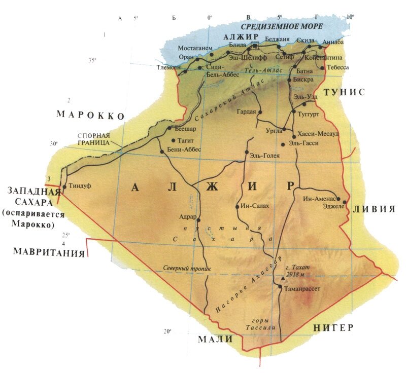Алжир получил независимость от Франции в 1962 году. Полное название государства Алжирская Народная Демократическая Республика. Пустыня Сахара занимает 80% территории страны. Алжирцы употребляют пищу, сидя на полу на коврах и подушках. Из-за высокого уровня браконьерства и большого количества охотников в Алжире фактически не осталось животных. Самый распространённый вид спорта в Алжире - футбол. С 1958 года в Алжирском университете студенты изучают русский язык. В стране находится необычное озеро, которое наполнено чернилами, пригодные для письма. Но ничего сверхъестественного в происхождении озера нет, притоком его являются две небольшие реки. В первой реке повышено содержание солей железа, а в другой — преобладают органические вещества, которые впитываются в воду, проходя через торфяные почвы и болота. Таким образом, результатом смешения этих вод в озере является новое химическое соединение — чернила. Военнослужащим Алжира запрещено вступать в брак с иностранками. Алжир стал первой а