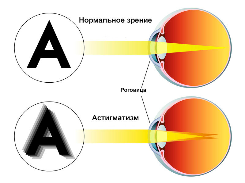 Астигматизм - это состояние, при котором лучи света, проходящие к сетчатке, преломляются неодинаково в разных меридианах. К примеру, лучи, проходящие в горизонтальной плоскости преломляются сильнее, чем лучи, проходящие в вертикальной. Почему это происходит? Наиболее часто астигматизм возникает, потому что роговица имеет не абсолютно сферичную форму, а более выпуклую в одной из плоскостей. Второй причиной может быть такое же изменение в хрусталике. В результате этого на сетчатке возникает не единое изображение, а несколько нечетких изображение одновременно. Проявляется астигматизм в виде искажения предметов вокруг, появление как бы дополнительных, дублирующих предмет контуров, возникновение несимметричных лучей, вокруг источников света в условиях низкого освещения. Как возникает астигматизм? Чаще всего, астигматизм это врожденное состояние. Астигматизм до 0,75D считается физиологическим, не требует коррекции и встречается почти у каждого жителя планеты. Иная причина возникновения - тр