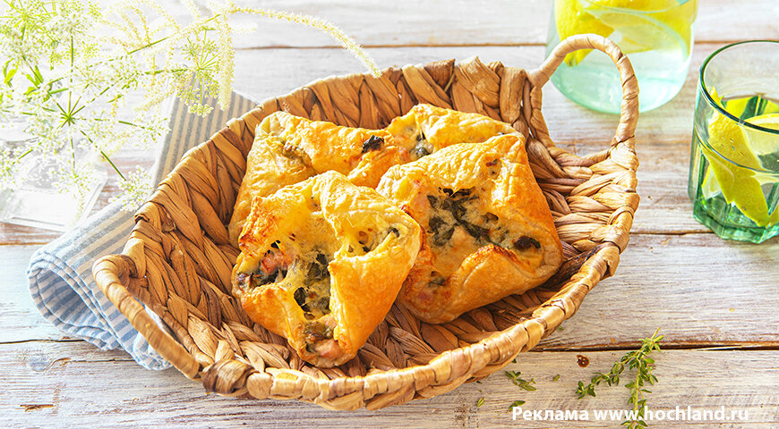 ИНГРЕДИЕНТЫ ПОШАГОВЫЙ РЕЦЕПТ ПРИГОТОВЛЕНИЯ Шаг 1 Предварительно разогрейте духовку до 190°С. Шаг 2 Слегка раскатайте слоеное тесто и нарежьте листы теста на квадраты со стороной 13 см. Шаг 3 Растопите сливочное масло на среднем огне в кастрюле. Добавьте муку и соль, варите 1 мин, часто помешивая. Влейте теплое молоко в 2 приема, постоянно помешивая, доведите смесь до кипения. Шаг 4 Уменьшите огонь до минимума и варите, периодически помешивая, пока соус не начнет густеть. Добавьте шпинат и готовьте 1 мин, снимите с огня. Шаг 5 Ветчину нарежьте небольшими кубиками, сыр натрите на терке. Добавьте ветчину и половину сыра в шпинатную смесь. Шаг 6 Выложите квадратики слоеного теста на противень, застеленный бумагой для выпечки. В центр квадратов выложите 2–3 ст. л. начинки и посыпьте сыром. Шаг 7 Заверните углы слойки к центру. Смажьте тесто слегка взбитым белком и выпекайте 20 мин.