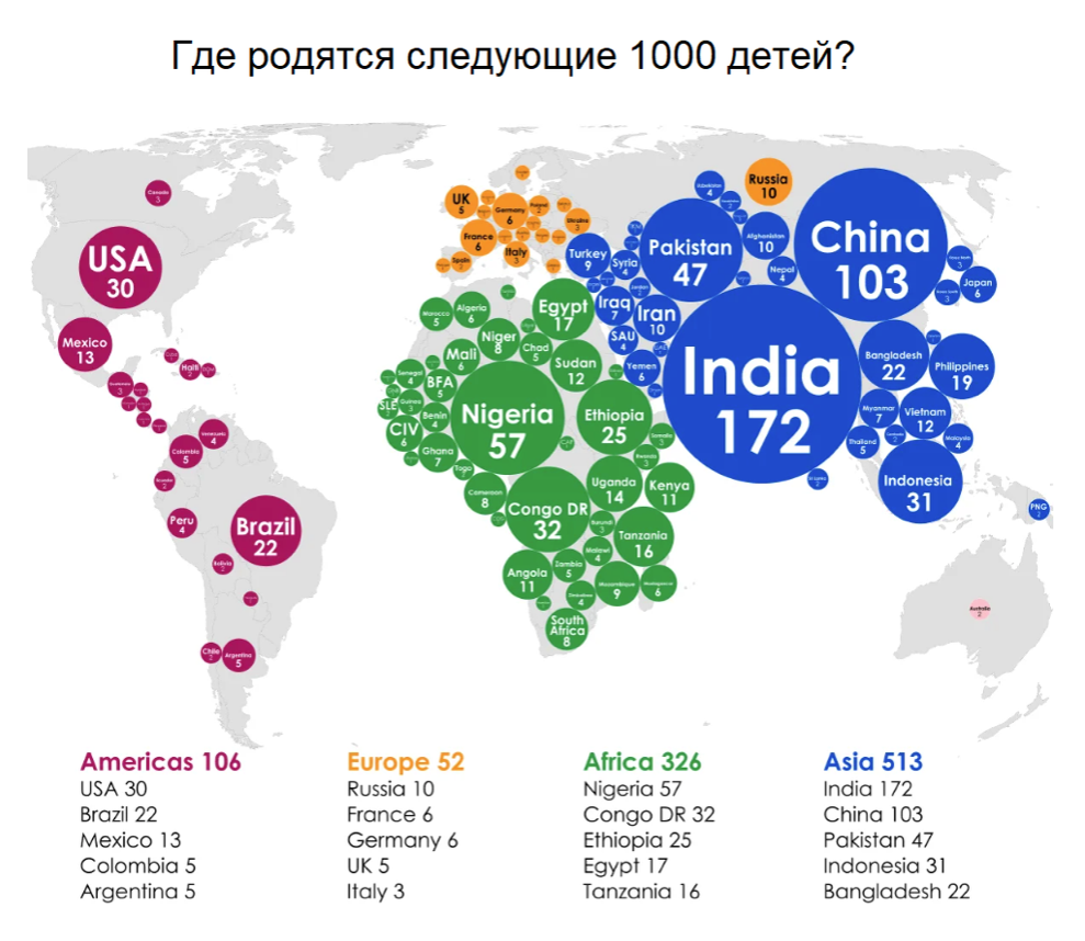 Есть в нашей жизни вещи постоянные, с которыми человечество знакомо очень давно: рождение и смерть людей. Мир постоянно меняется и некоторые данные можно прогнозировать довольно точно, а именно где и в каком количестве появятся новые люди, а, следовательно, где сегмент, связанный с детскими товарами будет пользоваться повышенным спросом. На карте явно выражена тенденция, в которой четко прослеживается, что каждый второй ребенок родится в Азии, а каждый третий в Африке. Обе Америки дадут миру только каждого десятого ребенка, а старая Европа почти прекратила заниматься детьми и только каждый двадцатый станет европейцем по праву рождения. Какие товары первыми приходят на ум? Подгузники, детская гигиена, игрушки, детская фармакология, одежда, обувь, книги, мебель. Разнообразная электроника: радионяни, детские мультимедиа устройства, бесконтактные термометры и т.д. Образование, аудио и видео контент, игры – современные и быстро масштабируемые IT-отрасли, которые тоже не стоит забывать при в