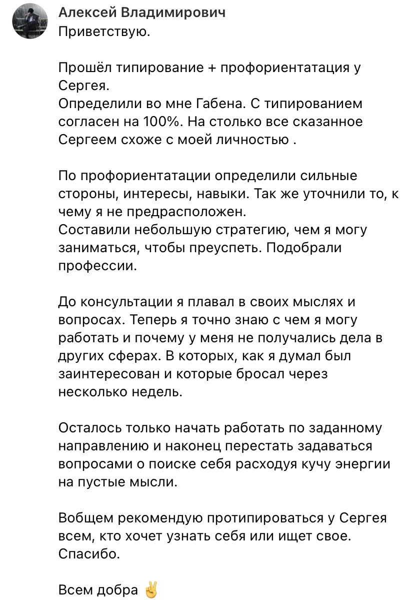 Выкладываю свежий отзыв от Габена Алексея из города Стерлитамак. Он всю жизнь искал себя. Интересы Алексея: 🎸Гитара, вокал 👨🏭Сварка, обработка металла 👞Работа с изделиями из кожи, браслеты 💪Бодибилдинг 🥊Бокс, карате 🏦Бизнес, финансы 🧙Нумерология, эзотерика 👨👧👦Благотворительность 🌿Траволечение 👨🎨Рисование 👨💻Веб-дизайн, фотошоп 🎧Битмейкинг Для иррационала нормально иметь множество увлечений и целей. Вполне Алексею подойдёт параллельно заниматься веб-дизайном, делать браслеты из кожи и осваивать фондовый рынок. Что же нам говорит западная Джековская профориентология? Дескать, ты должен найти своё единое призвание. Масса сайтов пестрят одинаковыми заголовками: «Найди предназначение», будто бы у всех людей должно быть только одно какое-то дело жизни. Тем самым, ограничивают многих людей. Да, для рационала долбить одно выбранное дело - норма. Но есть множество иррационалов, которым такая концепция жизни не подходит. Ибо иррационалы - многоцелевые люди, склонные к