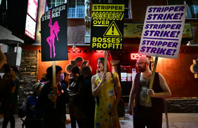 Итак, вот уже несколько месяцев подряд топлесс-бар Star Garden, что на бульваре Ланкершим в Северном Голливуде, пикетируют сразу несколько десятков его бывших работников. Они утверждают, что столкнулись с немотивированными увольнениями, небезопасными условиями труда и проблемами с компенсацией.