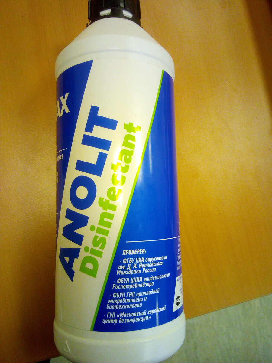 Антисептик Anolit Disinfectant (Анолит Анк Супер). В 2019 году с началом этой истерии когда ни кого не выпускали из дома, под предлогом только похода в аптеку и дабы купить что ни будь себе пожрать и то в крайней необходимости, встал вопрос покупке какого нибудь антисептика, так как работа на которой я работаю ведёт не прерывное производства и по этому надо работать и работать без каких либо сидения дома в майские праздники неделями. А так как в самом начале пандемии толком и масок в продаже не было, ни говоря уже об антисептиках я купил в магазине то что было и это оказалось как раз таки это средство. Проверенное ФГБУ НИИ вирусологии им. Д.И. Ивановского и другими подобными организациями. Бутыль этот достаточно большой и не лёгкий, так как вес его составляет 1,5 килограмма. По поводу убийство вирусов на коже я сказать ни чего не могу, но что средство довольно таки вонючее это точно, когда обрабатываешь им руки. Шмон стоит не выносимый, по запаху очень похожей на хлорку. Да и для кожи