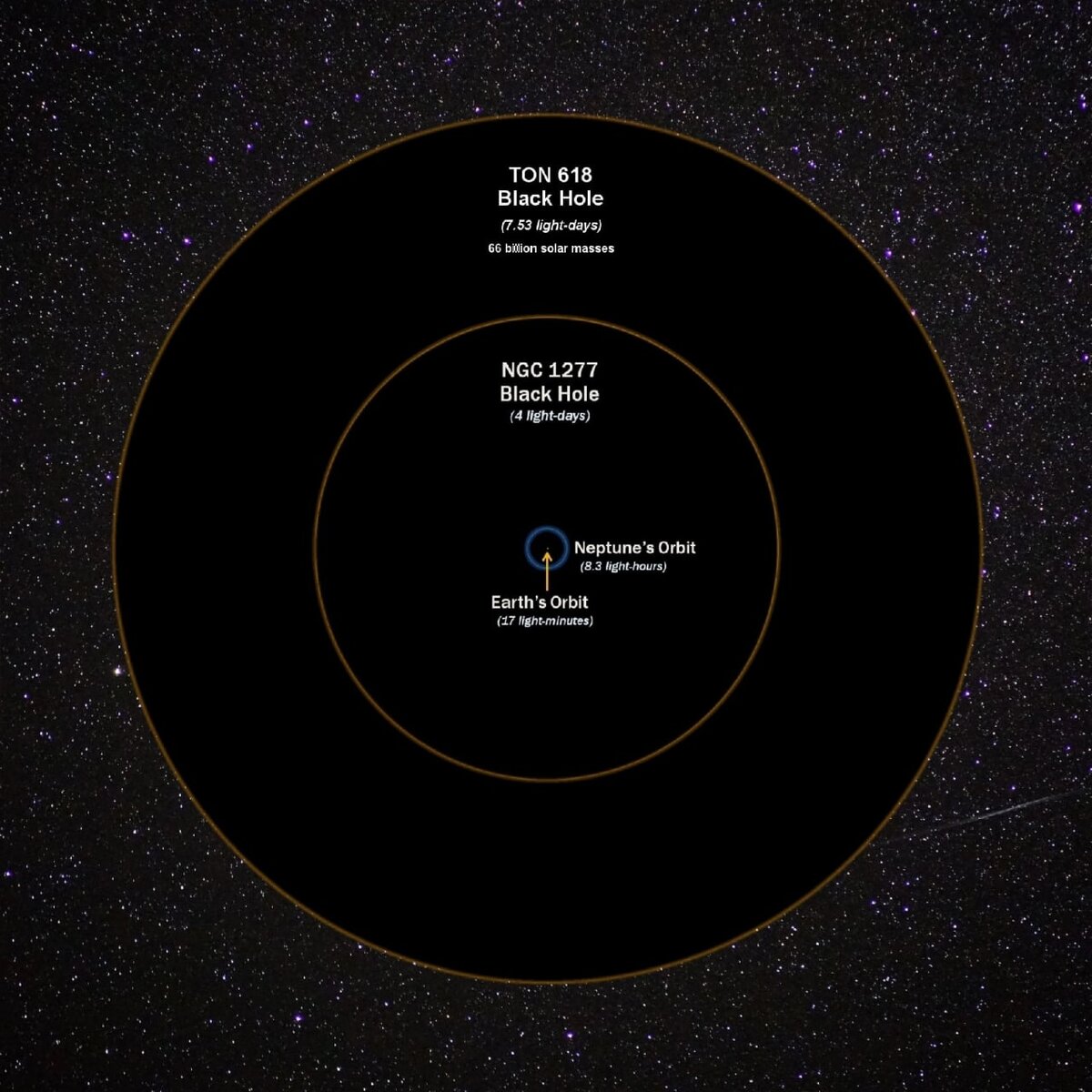 Предполагается, что у квазара TON 618 имеется аккреционный диск горячего газа, который вращается вокруг гигантской чёрной дыры в центре галактики. По оценкам, расстояние до квазара составляет 3,18 гигапарсек или 10,37 млрд световых лет. Галактика, в центре которой находится квазар, не видна с Земли из-за яркости самого квазара. Абсолютная звёздная величина квазара равняется −30,7, его светимость составляет 4*10^40 Ватт, что в 140 триллионов раз превышает солнечную. Эмиссионные линии в спектре TON 618 необычно широкие, что означает, что газ в аккреционном диске перемещается с очень высокой скоростью, около 7000 км/с. Масса чёрной дыры по разным оценкам составляет 66 млрд масс Солнца. Для сравнения, черная дыра Стрелец А, в центре нашей галактики Млечный Путь имеет массу в 4 миллиона Солнц. TON 618 массивнее даже некоторых галактик! Радиус гиганта составляет 2600 астрономических единиц или примерно 360 световых часов.