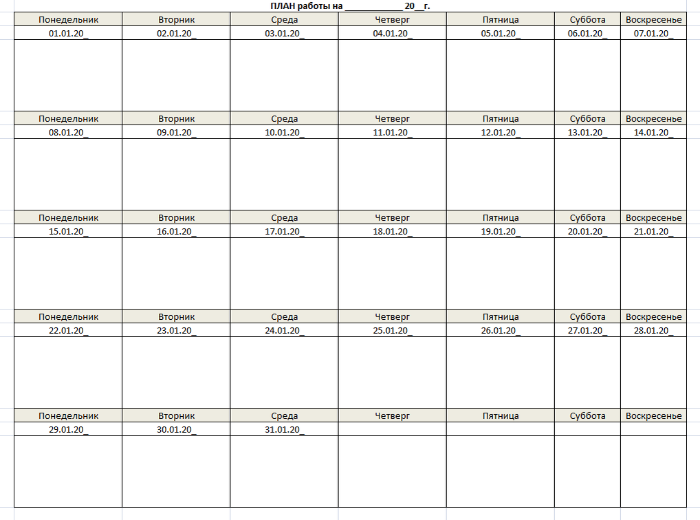 1. Составляем типовой шаблон (форму), которую будем использовать как основу для составления плана на текущий месяц