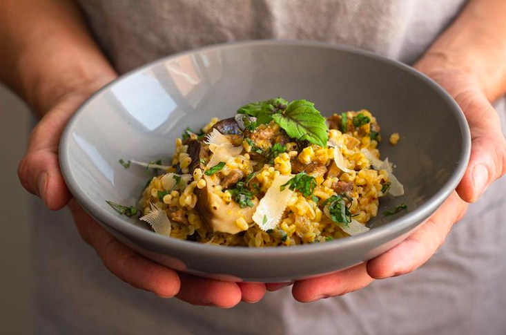 🌶 Когда вода выпарилась добавляем ещё 1 ст.л. оливкового масла, увеличиваем огонь до среднего, добавляем крупно нарезаные зубчики чеснока и крупно нарезаные грибы. Хорошо все обжариваем минут 5 . Солим, перчим, добавляем мускатный орех и булгур ,прожариваем ещё 3 минуты, вливаем бульон и готовим 15 минут под крышкой.