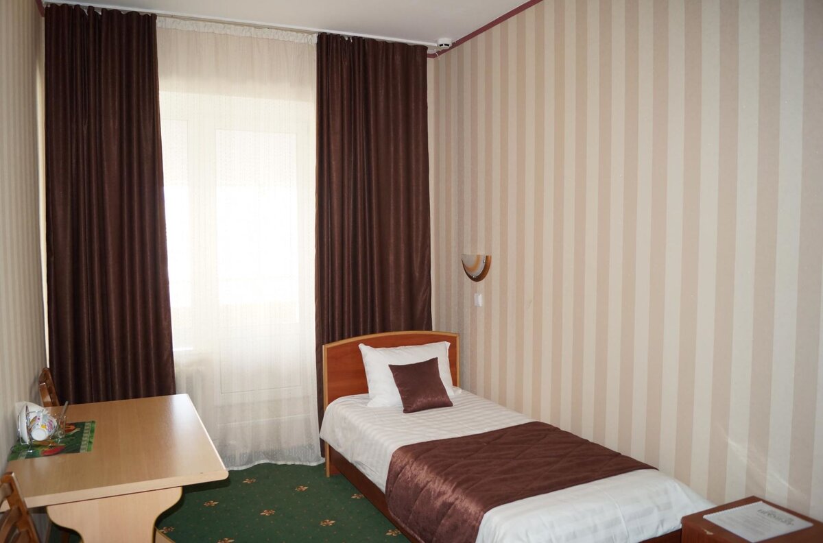 Стандартный номер для одного постояльца Уютный номер класса «Стандарт» позволит с комфортом разместиться 1 человеку. В комнате располагается удобная кровать, тумба, шкаф, стол со стульями. В каждом номере есть персональный санузел с душем, раковиной, унитазом, туалетным принадлежностями и балкон.