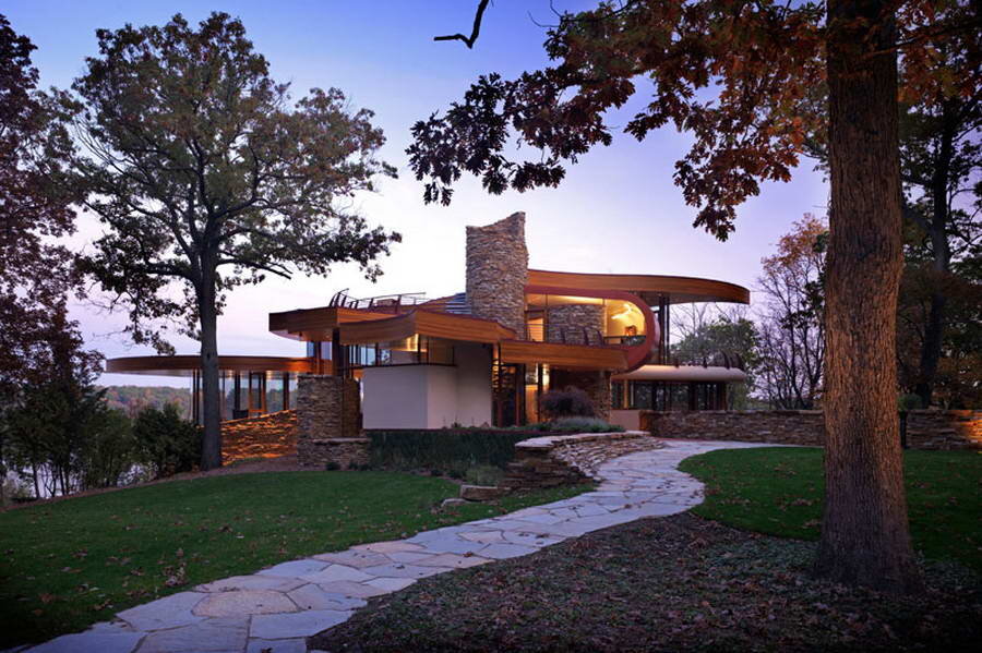 Органический стиль - один из самых сложных в архитектуре (особенно частной), причём не только (и даже не столько) для архитекторов, сколько для строителей. Здесь практически не бывает типовых деталей и каждая требует индивидуального подхода и практически ручной работы. Работы американского архитектора Роберта Харви Ошатса (Robert Harvey Oshatz) отличаются мягкостью, слиянием с природой, а также неподражаемым органическим стилем. Характерной особенностью его проектов является сложная, многоликая архитектура с плавными природными формами и линиями. Этот дом построен на живописном участке на берегу озера. Используя обычные материалы — дерево, камень и стекло, — архитектор придаёт им уникальное звучание, архитектура настолько динамична, что дом, фактически, не имеет устойчивых фасадов — они изменяются с малейшей переменой точки обзора. Внутреннее пространство простирается вокруг центрального атриума, в котором расположена цилиндрическая каменная конструкция с винтовой лестницей. Практическ