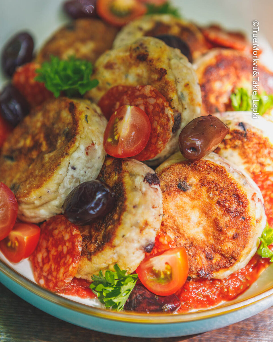 Сразу отсею вопросы, возникшие после прочтения заголовка: ⁃ А так можно было? ⁃ Можно и нужно. ⁃ А это вкусно? ⁃ Потрясающе, словно пицца на завтрак, но в сырниках. ⁃ А сырники бывают несладкие? ⁃ Еще как бывают. ⁃ А как оно потом? ⁃ Жив, цел, орел. Данное экспериментальное блюдо, скорее всего, все еще вызывает скепсис у лиц, давно промышляющих приготовлением сырников исключительно на завтрак. Но мы и не призываем бросить все и побежать греметь сковородками. А хотим показать, что немного фантазии и желания могут перевернуть представление о привычном блюде. И подарить новые приятные вкусовые ощущения. Мы остались довольны и планируем снова их повторить. Ингредиенты на 2 порции: - 360 г творога - 1 желток - 2 ст. л. кукурузной муки + на обвалку - 50 г сыра моцарелла - 50 г пеперони - 50 г маслин - 50 г вяленых томатов - 1 ч. л. итальянских трав - соль и перец по вкусу 1. Пеперони, маслины и томаты мелко нарежьте, моцареллу натрите на крупной терке. 2. Смешайте все ингредиенты в глуб